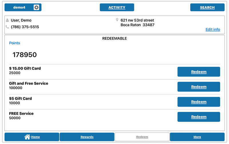 To check the activity or account history of the client such as points or dollar additions, redeemed goods, etc., press the “ACTIVITY” button in the top middle part of the screen.