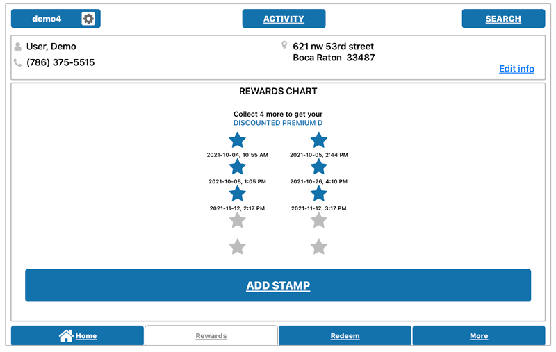 Now, let’s proceed to the rewards chart. At the bottom of the screen, you will see the “REWARDS” button. In this section, you can add stamps to your client’s account after each purchase or visit. When your customers make a certain number of purchases/visits, he/she will get enough stamps to get eligible rewards. To add a stamp click the “ADD STAMP” button.
